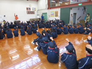 晴天の中、105名全員元気で岡山市立少年自然の家に到着しています。今、ネイチャーワークに各班挑戦中です。
