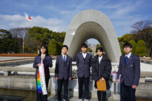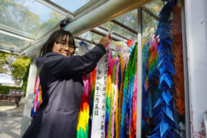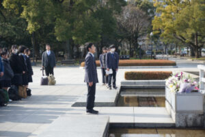18期生全員で作った「平和宣言」を代表の小田くんが読み上げ、折り鶴を献納しました。